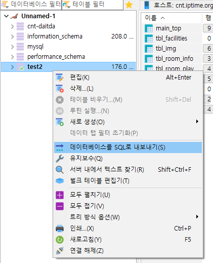 HeidiSQL을 통해 데이터베이스에 접속한 후 내보낼 DB를 우클릭하여 '데이터베이스를 SQL로 내보내기' 선택