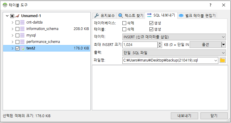 데이터베이스, 테이블 중 SQL로 내보내기가 필요한 요소만 생성에 체크하고 경로를 지정하여 내보내기 클릭.